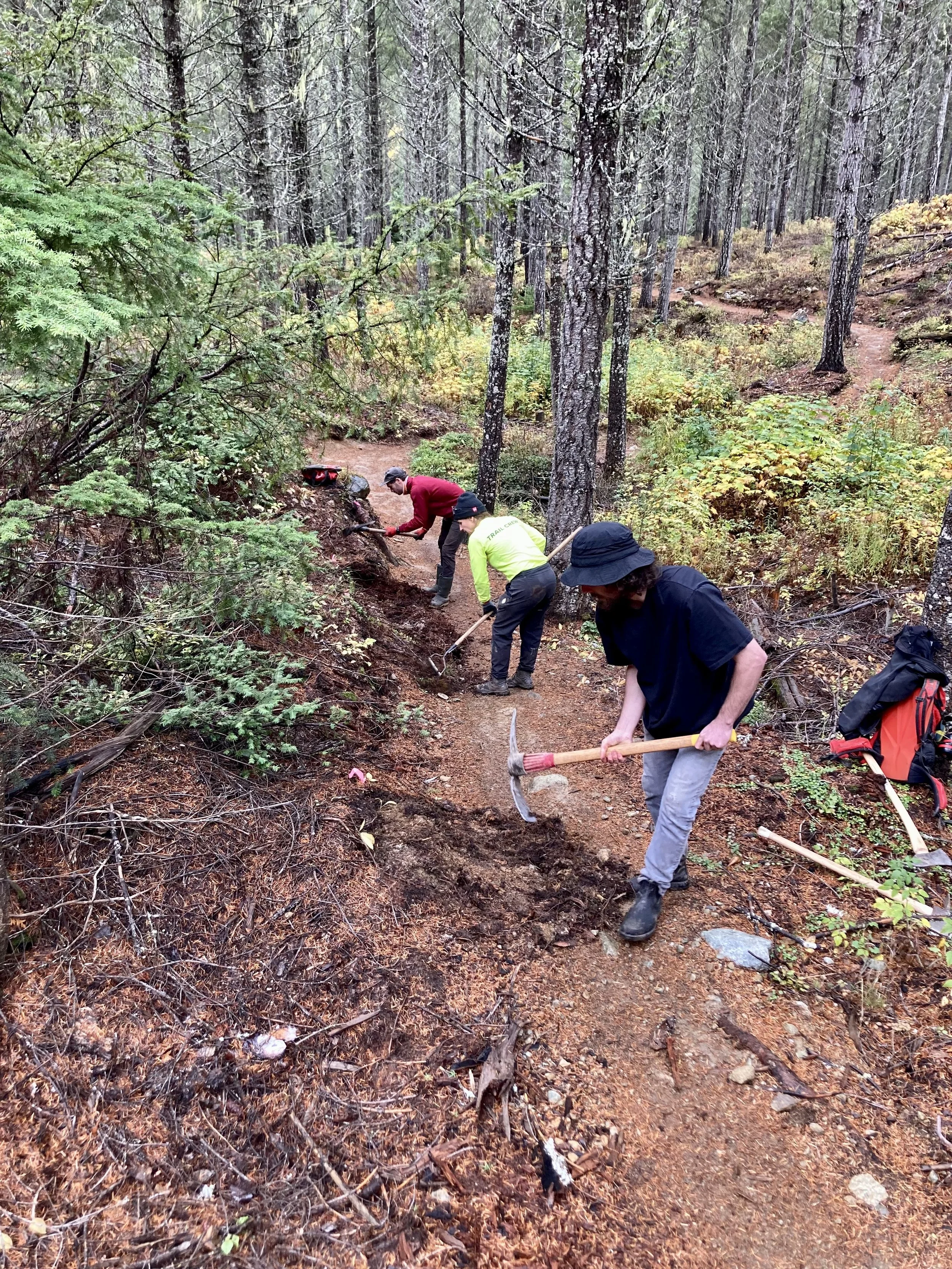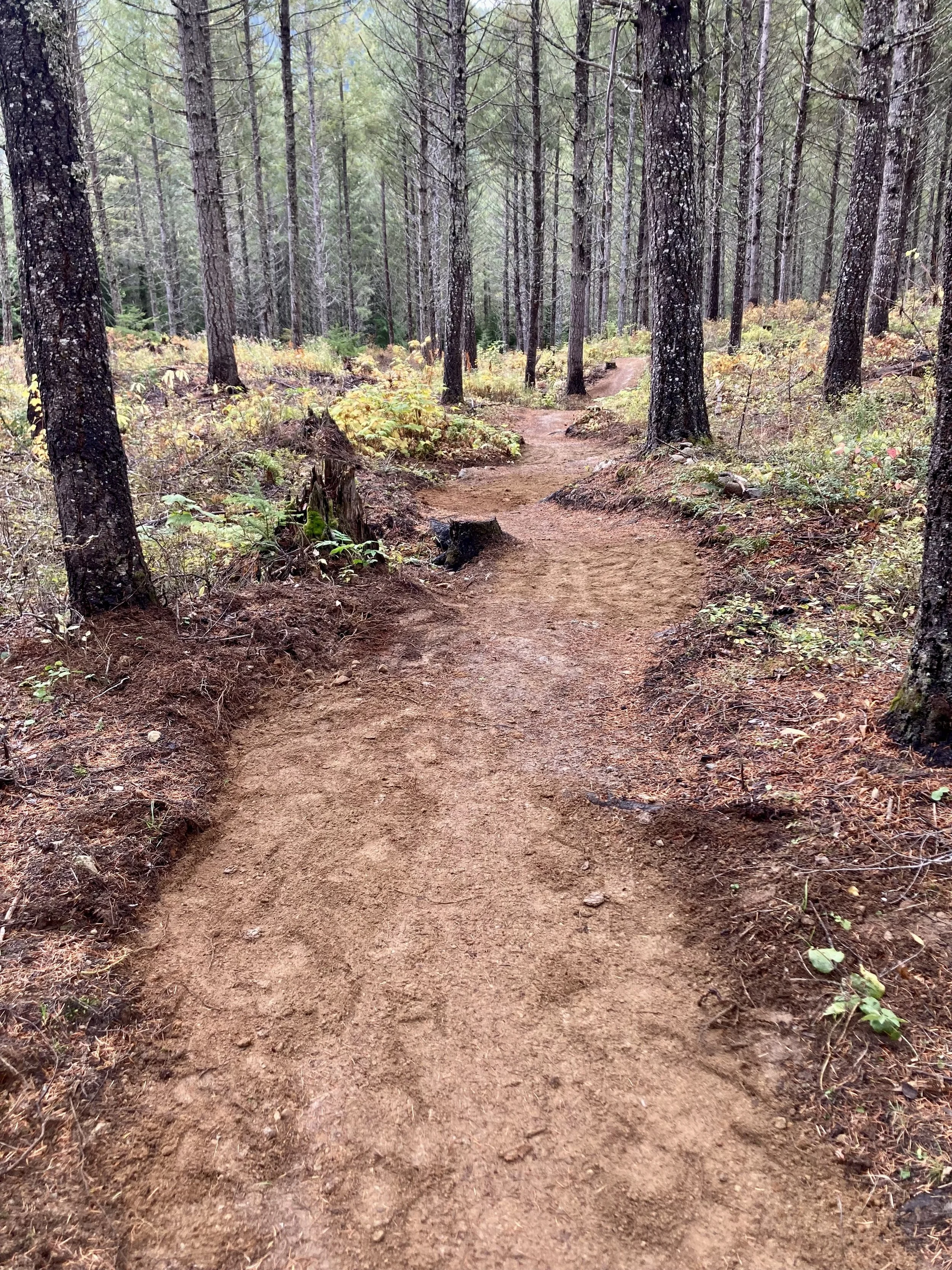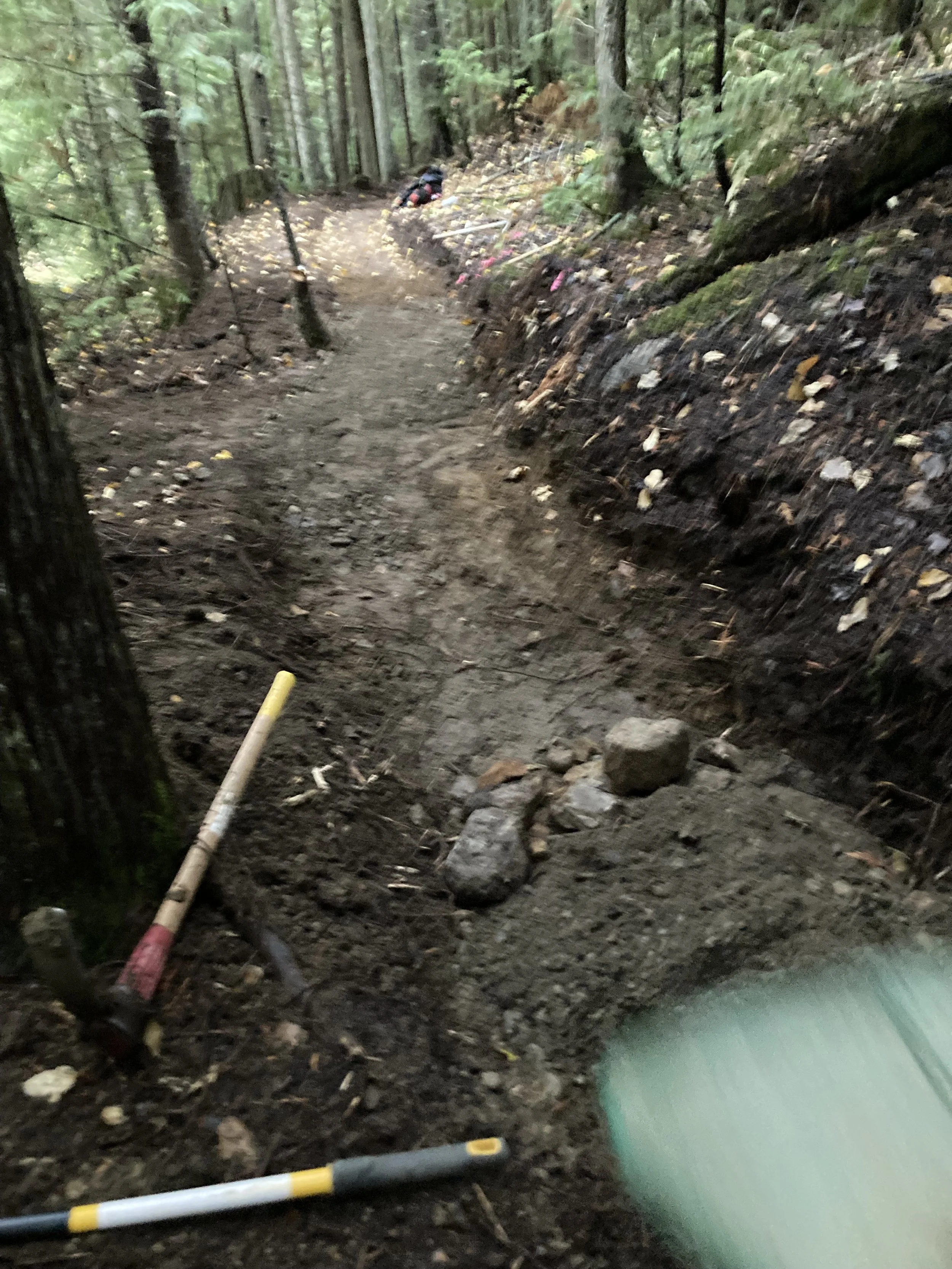 The fresh tread we laid down really got put to the test by the sudden saturation. I went out to check up on our work when the atmospheric river let up (Thursday afternoon) and found deep tire ruts in the gooey mineral soil. Time to dry is what the trail now needs to “cement”. This serves as a reminder to please stay off our smooth dirt trails during heavy weather events this Fall. I’m emphasizing this message specifically for this summer’s freshest work: Far Out 3, Flashback 1 and Flashback 5.