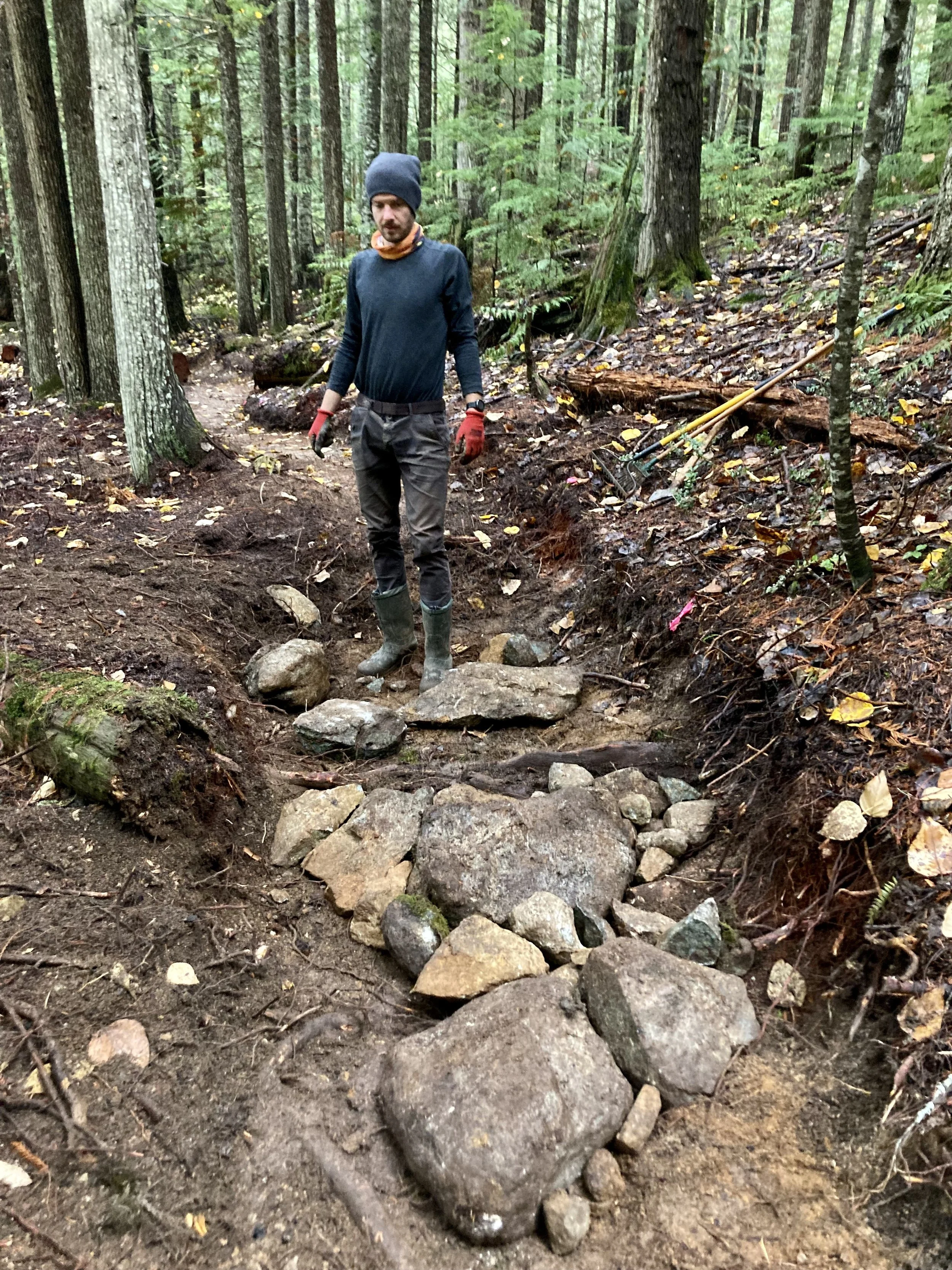 I knew heavy weather was coming, and so did the bugs! We experienced an unexpected resurgence of black flies. I thought we were done dealing with pesky pests flying into our eyes and throat. They were so bad that bug nets came back into style. I eventually “threw in the towel” and moved the team to a different worksite (sheltering in the trucks). Insect conditions were better down at Flashback 5 where we tried to armour and cap all the work that volunteers had started at the last trail night of the season. I thanked a sleepy salamander for eating many flies before heading into hibernation.