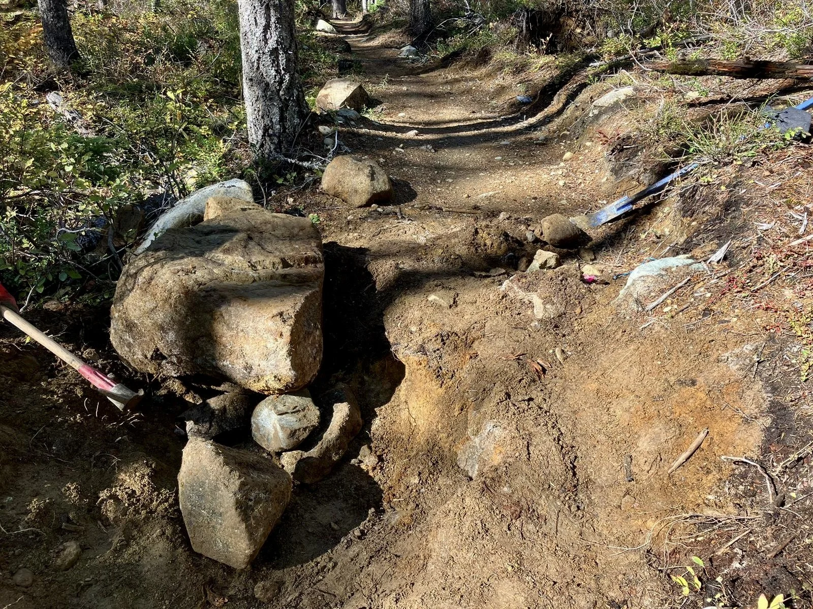 This week, the trail crew continued down Far Out 3, widening the tread to meet Adaptive-MTB blue standard. Pulling stumps and generally digging out the trail’s existing edge is pretty straightforward but a particularly large rock refused to budge… so we got to play with the big drill! Using equipment and techniques introduced to us by a local stonemason (Ken Melamed) we made short work of the (un)cooperative rock: it broke exactly where we nudged it.