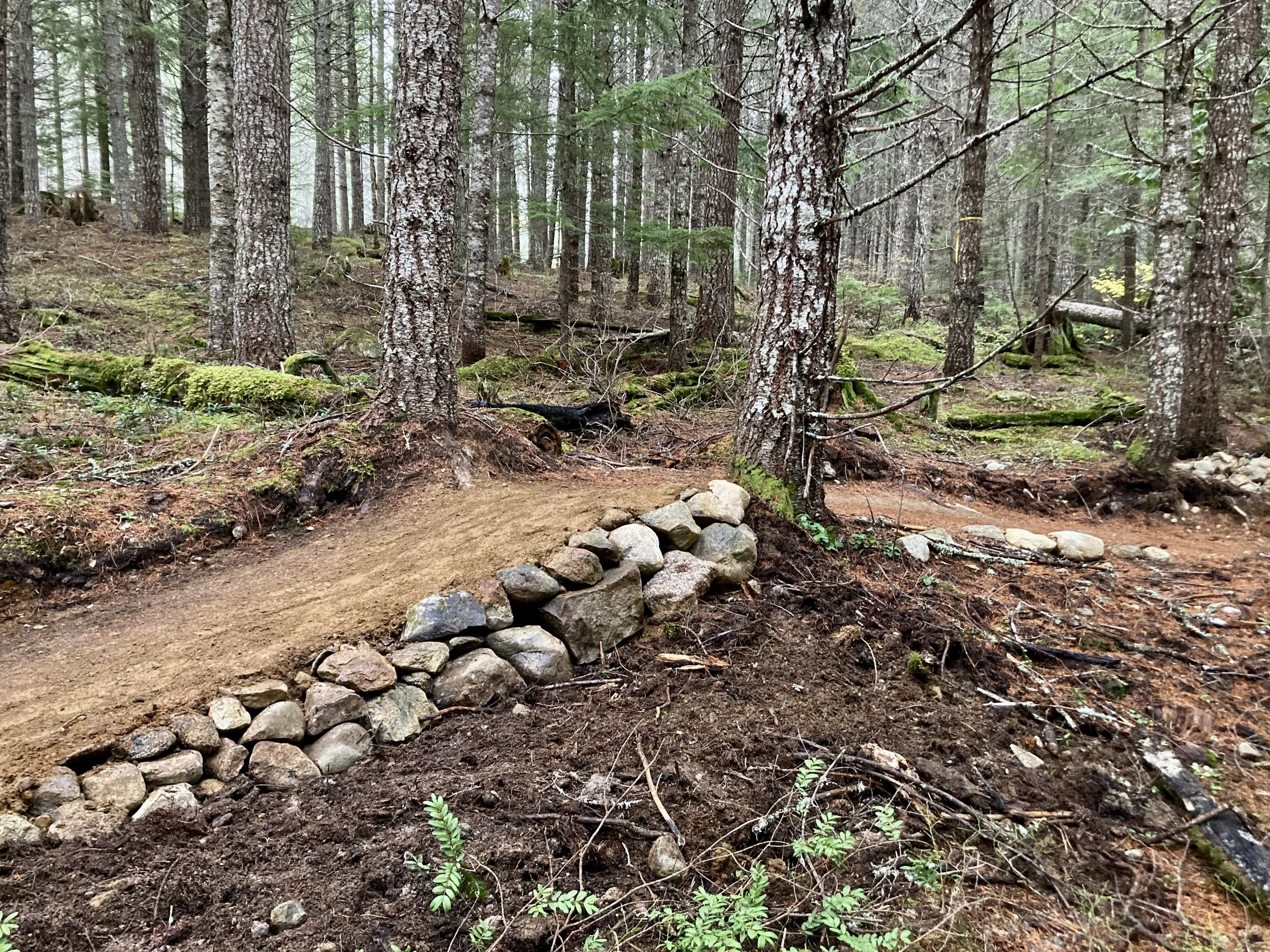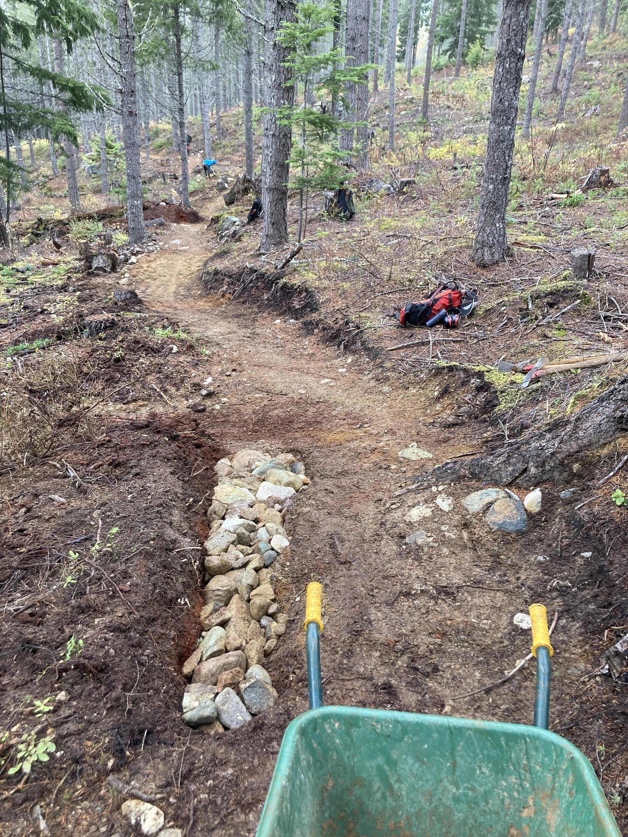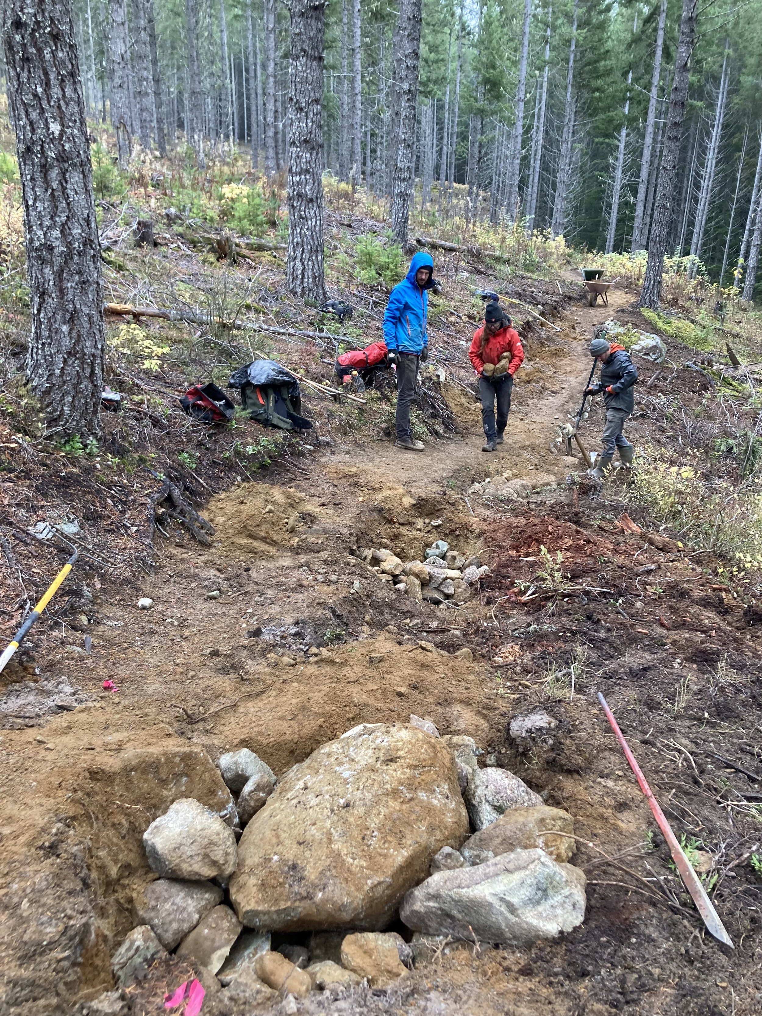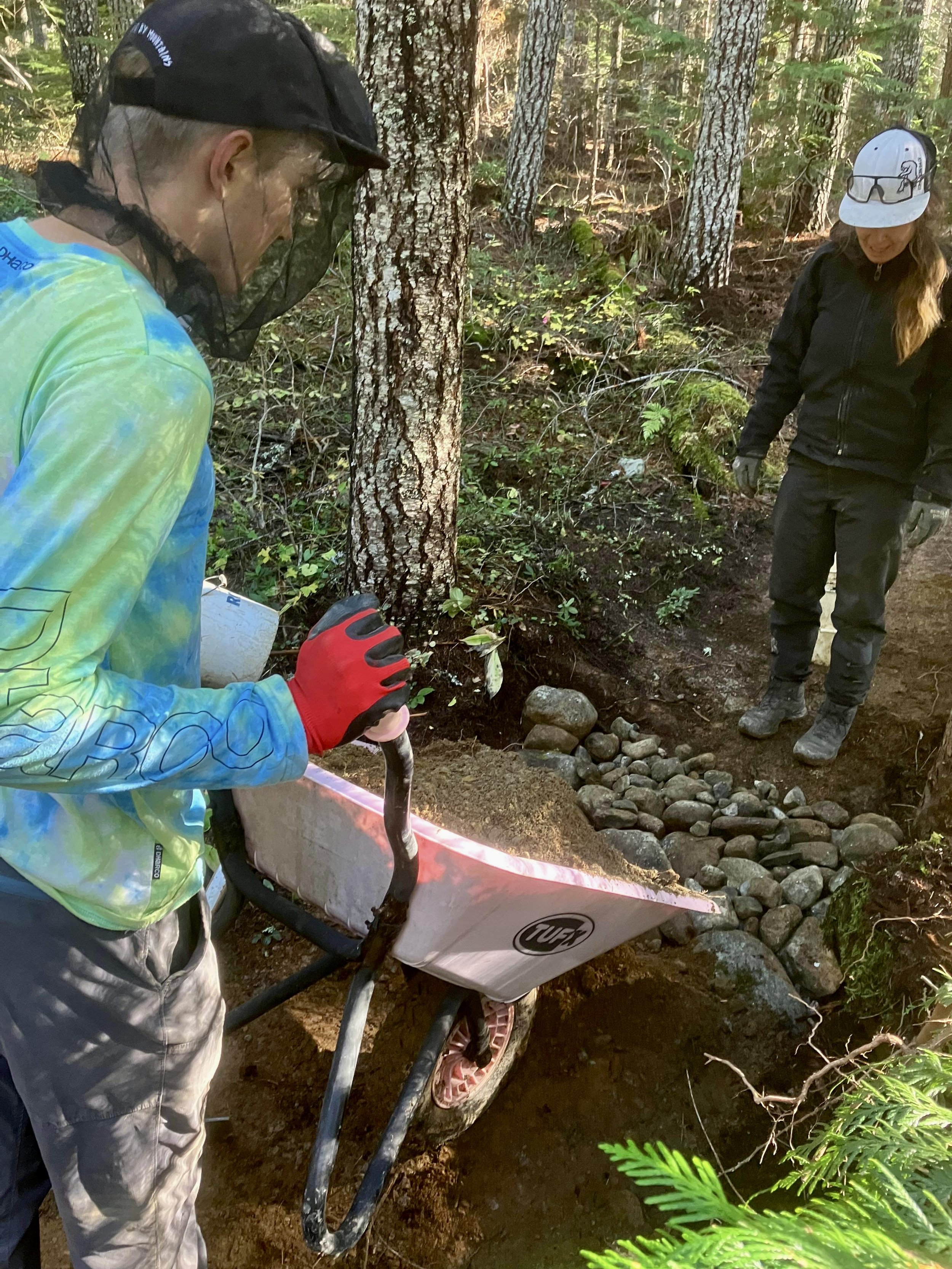 I spent last weekend at the WORCA Board of Director’s annual retreat. Between program reviews and planning discussions, we sampled trails on Eagle and Burke mountains in Coquitlam. The eerie fog made the forest so dark! This reminded me that the seasonal switch was imminent. I joined the trail crew on Monday as we returned to Far Out 3 with haste in our step: Winter is coming! You know how I love to finish a project, so we went full gas with the Adaptive-MTB blue rating upgrades. We pulled some stumps and benched through rotten logs. I wrestled with an “iceberg” rock as well… Everywhere we worked, we made huge craters in the trail. Filling those holes was easy and had a serendipitous side effect: We got to clean up all of the rocks piled along the trail during the original construction. On Tuesday, we prepared for cold rain but settled for snow all afternoon. The end was in sight and after a night time low of -5c, we completed Phase 1 of our Adaptive-MTB blue project. Huge thanks go out to Craig Mackenzie, who concocted this great inclusive initiative and “put his muscle where his mouth is” - digging away at this section of trail all summer!